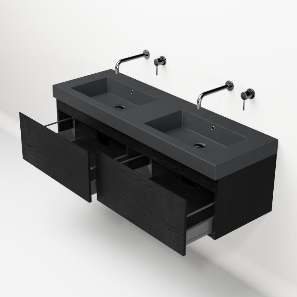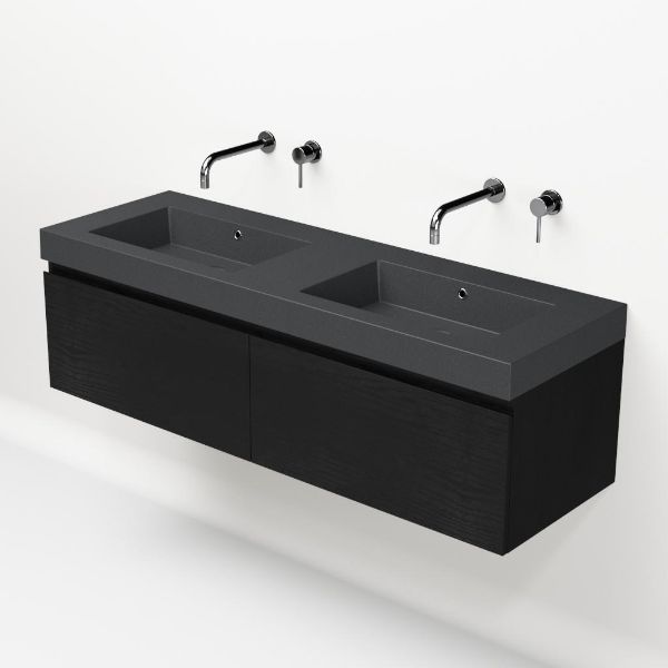 | Bellanti Solo/Esta-Q badmeubel 140x46 2 softclose laden mat zwart eiken greeploos quartz wastafel dubbel mat grijs zonder kraangaten |