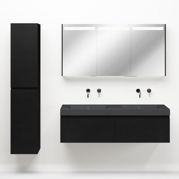 Greeploos badkamermeubel in de kleur zwart mat eiken is 140 cm breed. De wastafel is vervaardig in quartz en heeft de kleur grijs mat quartz. Dit badkamermeubel met deze wastafel is leverbaar tussen de 60 cm t/m 160 cm