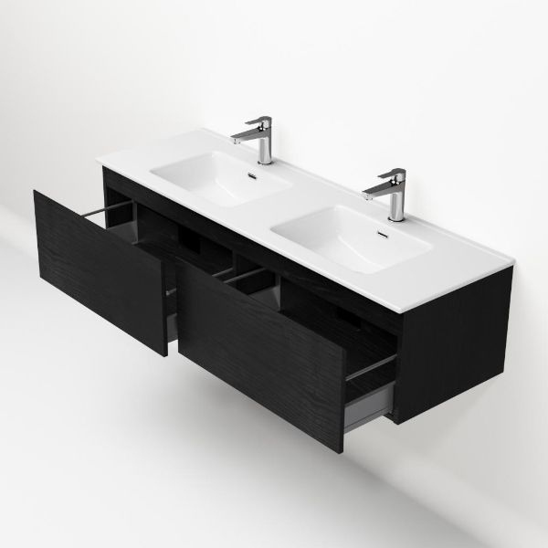 Greeploos badkamermeubel in de kleur zwart mat eiken is 140 cm breed. De wastafel is vervaardig in keramiek en heeft de kleur wit keramiek. Dit badkamermeubel met deze wastafel is leverbaar tussen de 60 cm t/m 120 cm