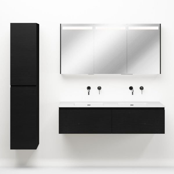 Greeploos badkamermeubel in de kleur zwart mat eiken is 140 cm breed. De wastafel is vervaardig in keramiek en heeft de kleur wit keramiek. Dit badkamermeubel met deze wastafel is leverbaar tussen de 60 cm t/m 120 cm