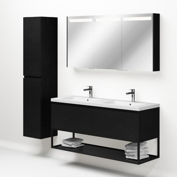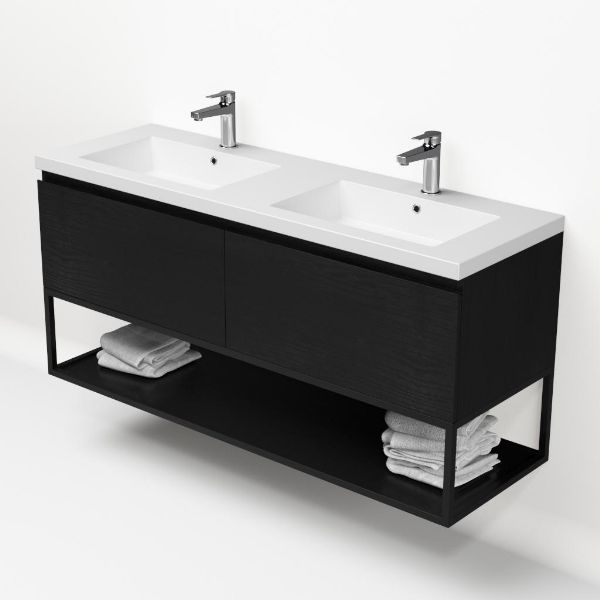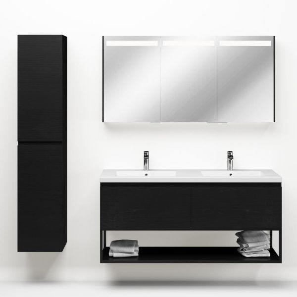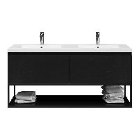 | | Bellanti Solo/Tela/Esta-Q badmeubel 140x46 2 softclose laden mat zwart eiken greeploos polystone wastafel dubbel mat wit met 2 kraangaten met mat zwart metalen frame |