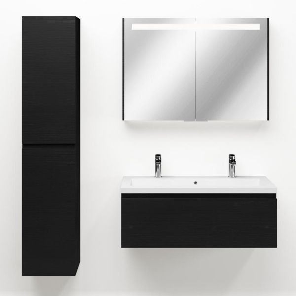 Greeploos badkamermeubel in de kleur zwart mat eiken is 100 cm breed. De wastafel is vervaardig in polystone en heeft de kleur wit. Dit badkamermeubel met deze wastafel is leverbaar tussen de 60 cm t/m 160 cm