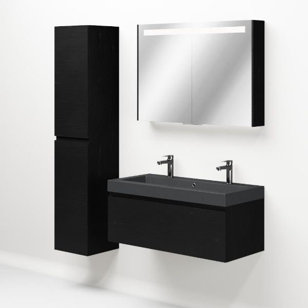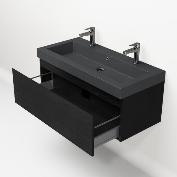 Greeploos badkamermeubel in de kleur zwart mat eiken is 100 cm breed. De wastafel is vervaardig in quartz en heeft de kleur grijs mat quartz. Dit badkamermeubel met deze wastafel is leverbaar tussen de 60 cm t/m 160 cm