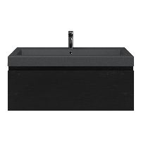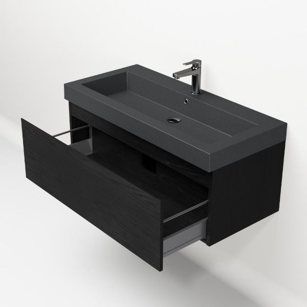 Greeploos badkamermeubel in de kleur zwart mat eiken is 100 cm breed. De wastafel is vervaardig in quartz en heeft de kleur grijs mat quartz. Dit badkamermeubel met deze wastafel is leverbaar tussen de 60 cm t/m 160 cm