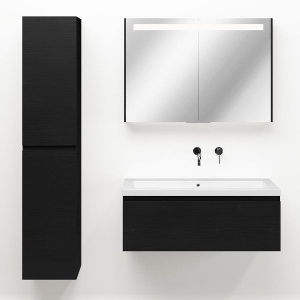 Greeploos badkamermeubel in de kleur zwart mat eiken is 100 cm breed. De wastafel is vervaardig in quartz en heeft de kleur wit mat quartz. Dit badkamermeubel met deze wastafel is leverbaar tussen de 60 cm t/m 160 cm