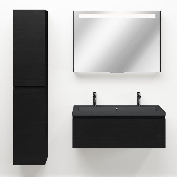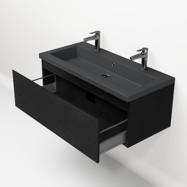 Greeploos badkamermeubel in de kleur zwart mat eiken is 100 cm breed. De wastafel is vervaardig in quartz en heeft de kleur grijs mat quartz. Dit badkamermeubel met deze wastafel is leverbaar tussen de 60 cm t/m 160 cm