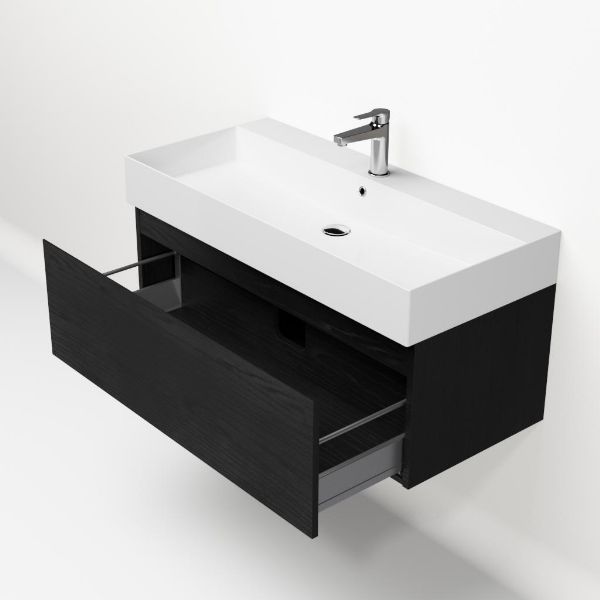 Greeploos badkamermeubel in de kleur zwart mat eiken is 100 cm breed. De wastafel is vervaardig in keramiek en heeft de kleur wit keramiek. Dit badkamermeubel met deze wastafel is leverbaar tussen de 60 cm t/m 160 cm