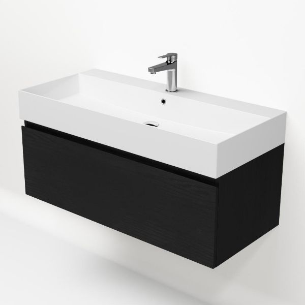 | | Bellanti Solo/Azzurra badmeubel 100x46 1 softclose lade mat zwart eiken greeploos keramische wastafel wit glans met 1 kraangat |