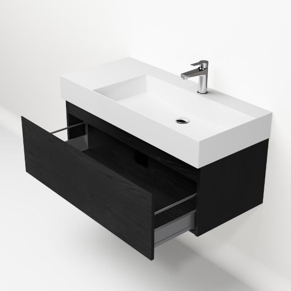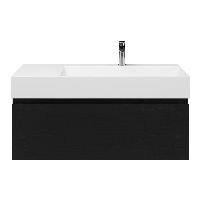 Greeploos badkamermeubel in de kleur zwart mat eiken is 100 cm breed. De wastafel is vervaardig in keramiek en heeft de kleur wit keramiek. Dit badkamermeubel met deze wastafel is leverbaar tussen de 60 cm t/m 160 cm
