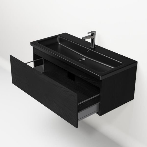 | | Bellanti Solo/Amelia badmeubel 100x46 1 softclose lade mat zwart eiken greeploos keramische wastafel zwart mat met 1 kraangat |
