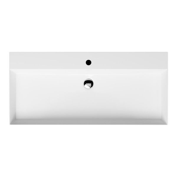 Greeploos badkamermeubel in de kleur zwart mat eiken is 100 cm breed. De wastafel is vervaardig in keramiek en heeft de kleur wit keramiek. Dit badkamermeubel met deze wastafel is leverbaar tussen de 60 cm t/m 160 cm