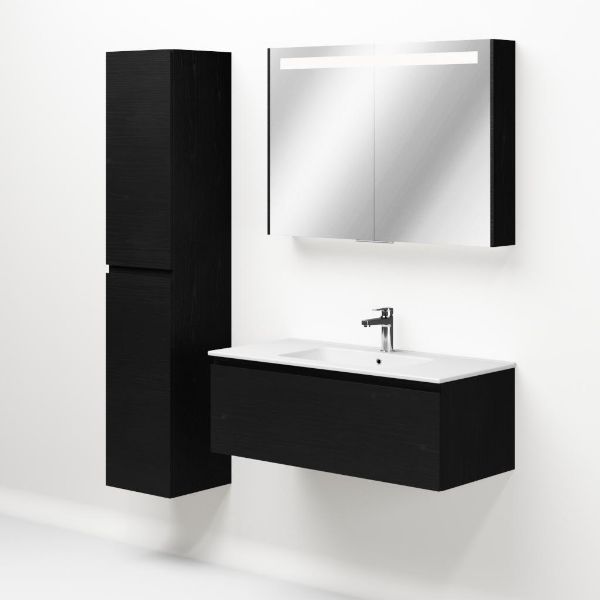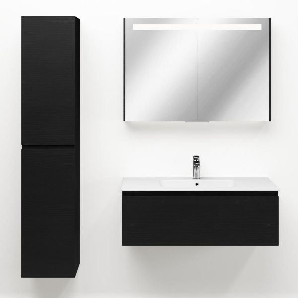 Greeploos badkamermeubel in de kleur zwart mat eiken is 100 cm breed. De wastafel is vervaardig in keramiek en heeft de kleur wit keramiek. Dit badkamermeubel met deze wastafel is leverbaar tussen de 60 cm t/m 120 cm