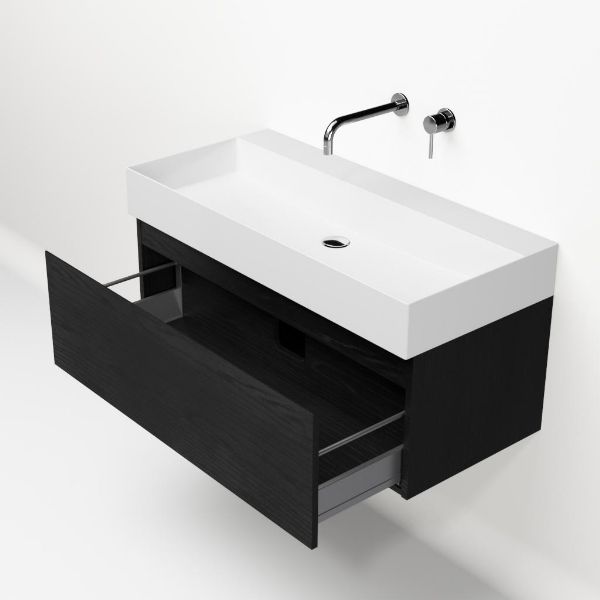| | Bellanti Solo/Azzurra badmeubel 100x46 1 softclose lade mat zwart eiken greeploos keramische wastafel wit glans zonder kraangaten |
