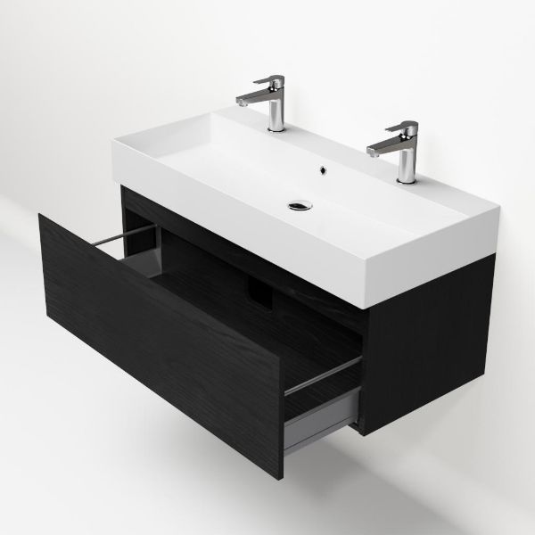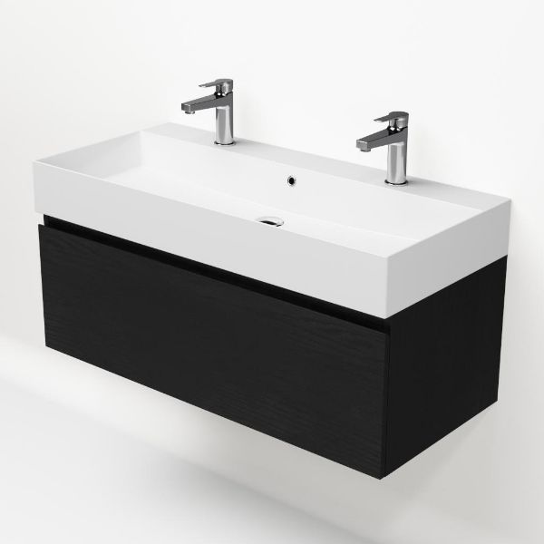 | | Bellanti Solo/Azzurra badmeubel 100x46 1 softclose lade mat zwart eiken greeploos keramische wastafel wit glans met 2 kraangaten |