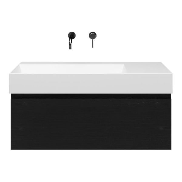 Greeploos badkamermeubel in de kleur zwart mat eiken is 100 cm breed. De wastafel is vervaardig in keramiek en heeft de kleur wit mat keramiek. Dit badkamermeubel met deze wastafel is leverbaar tussen de 60 cm t/m 160 cm