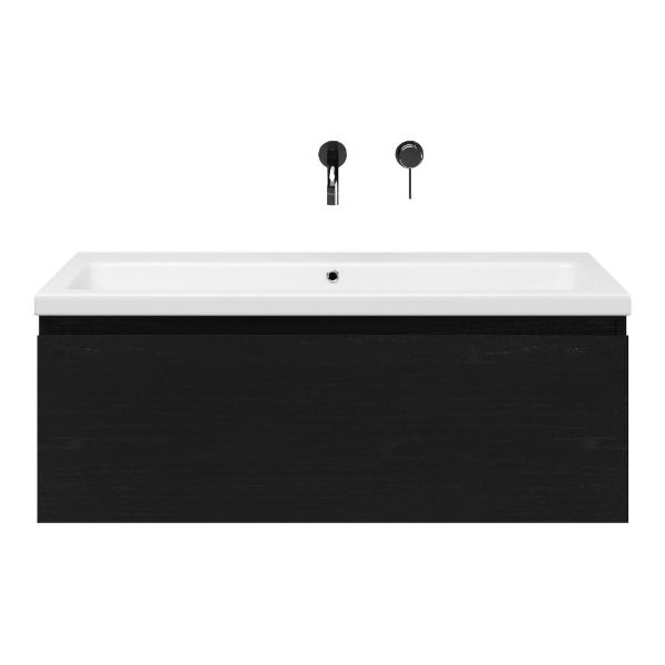 | | Bellanti Solo/Amelia badmeubel 100x46 1 softclose lade mat zwart eiken greeploos keramische wastafel wit glans zonder kraangaten |