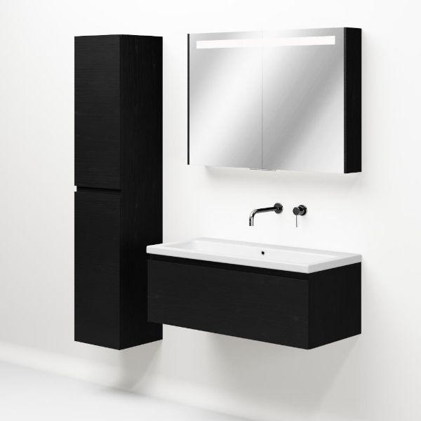 Greeploos badkamermeubel in de kleur zwart mat eiken is 100 cm breed. De wastafel is vervaardig in keramiek en heeft de kleur wit keramiek. Dit badkamermeubel met deze wastafel is leverbaar tussen de 60 cm t/m 140 cm