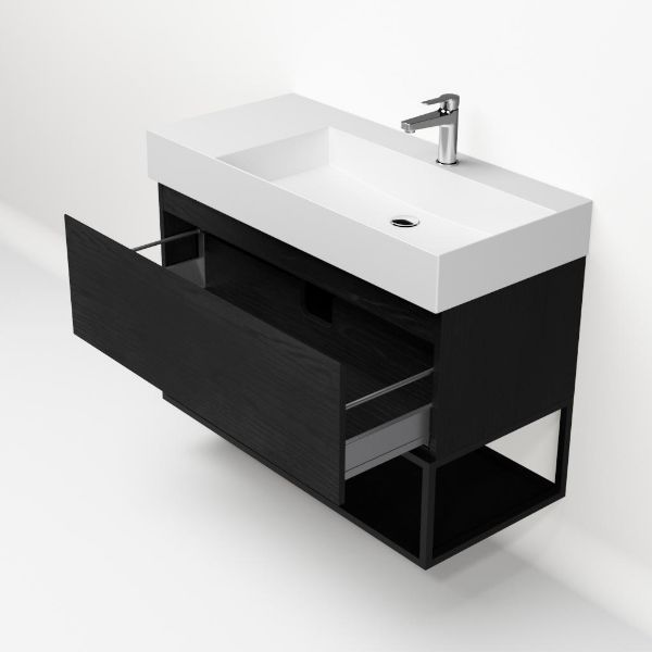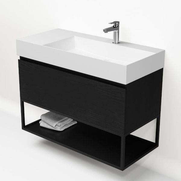 | | Bellanti Solo/Tela/Azzurra badmeubel 100x46 1 softclose lade mat zwart eiken greeploos keramische wastafel rechts wit mat met 1 kraangat met mat zwart metalen frame |