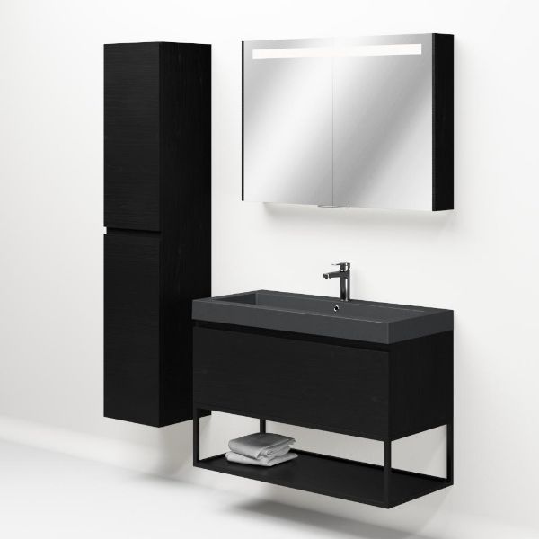 | | Bellanti Solo/Tela/Esta-Q badmeubel 100x46 1 softclose lade mat zwart eiken greeploos quartz wastafel mat grijs met 1 kraangat met mat zwart metalen frame |