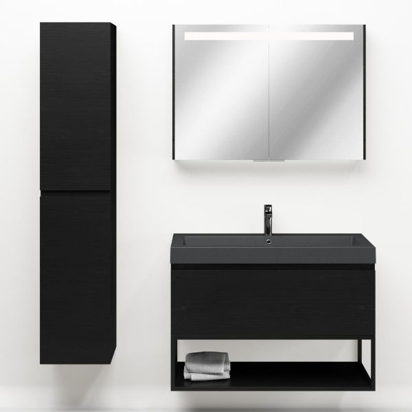 Greeploos badkamermeubel in de kleur zwart mat eiken is 100 cm breed. De wastafel is vervaardig in quartz en heeft de kleur grijs mat quartz. Dit badkamermeubel met deze wastafel is leverbaar tussen de 60 cm t/m 160 cm