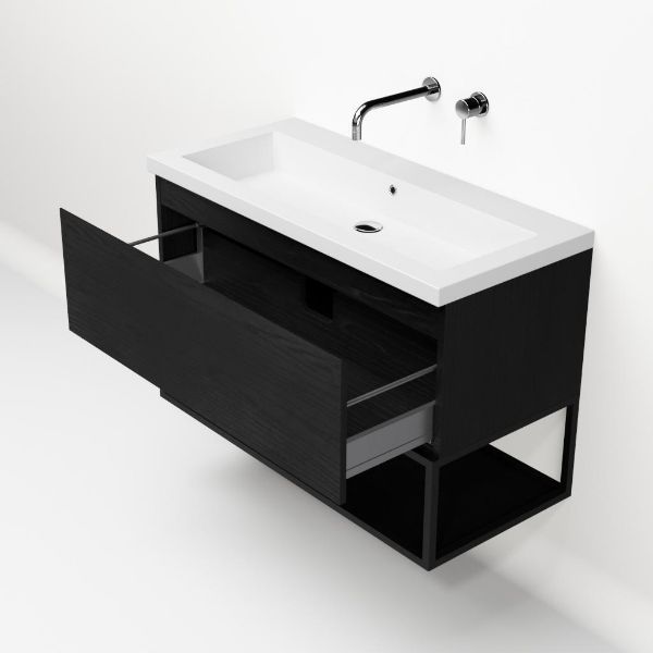 | | Bellanti Solo/Tela/Esta badmeubel 100x46 1 softclose lade mat zwart eiken greeploos polystone wastafel wit zonder kraangaten met mat zwart metalen frame |