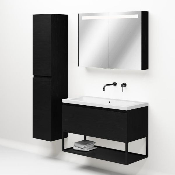 Greeploos badkamermeubel in de kleur zwart mat eiken is 100 cm breed. De wastafel is vervaardig in polystone en heeft de kleur wit. Dit badkamermeubel met deze wastafel is leverbaar tussen de 60 cm t/m 160 cm