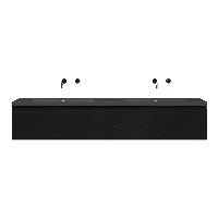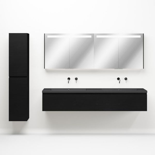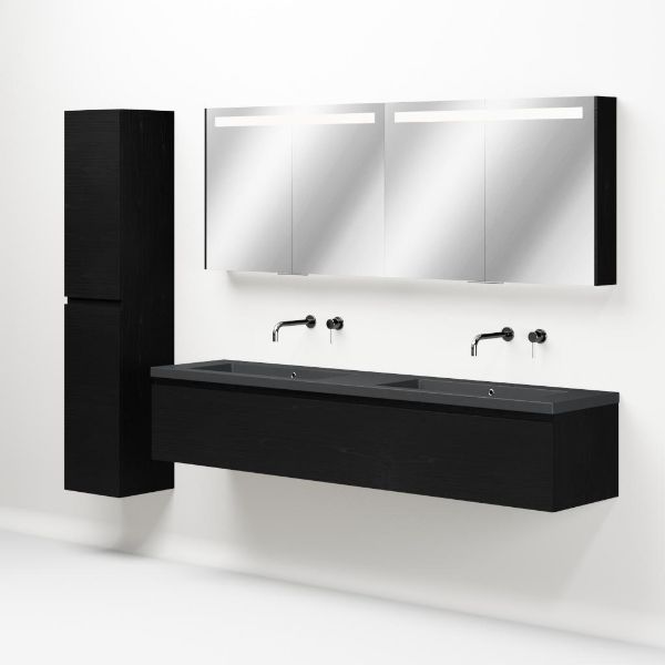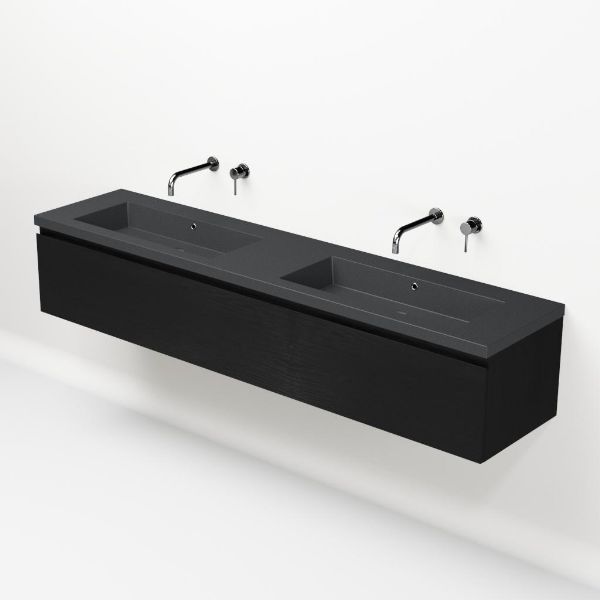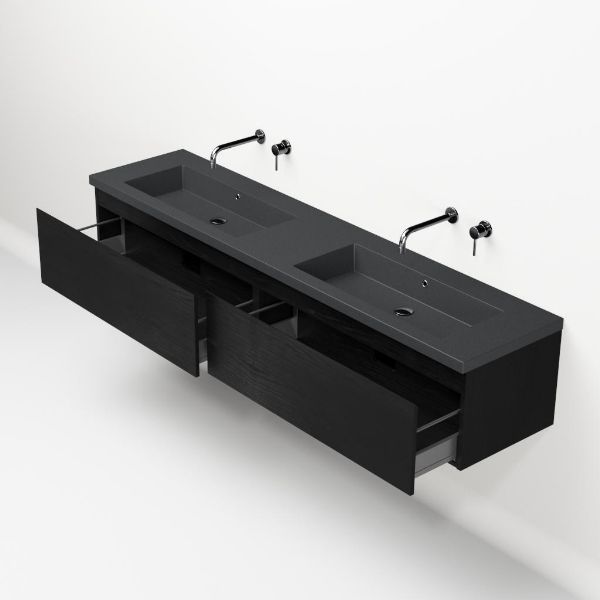 Greeploos badkamermeubel in de kleur zwart mat eiken is 200 cm breed. De wastafel is vervaardig in quartz en heeft de kleur grijs mat quartz. Dit badkamermeubel met deze wastafel is leverbaar tussen de 60 cm t/m 160 cm