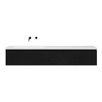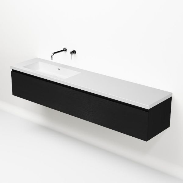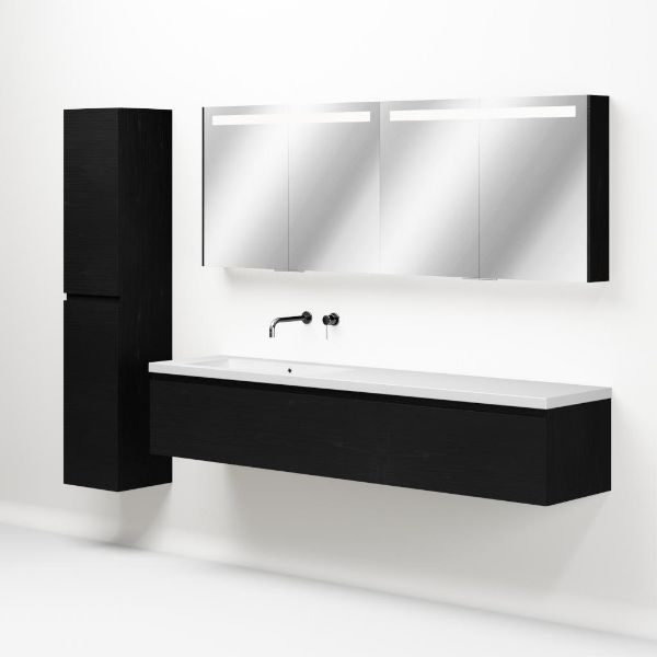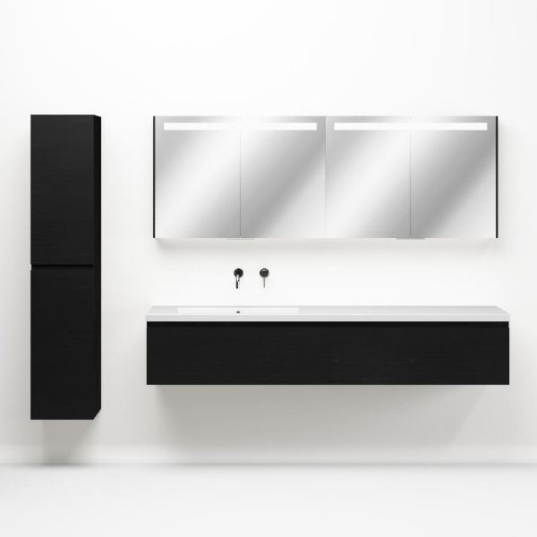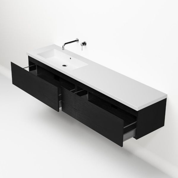 Greeploos badkamermeubel in de kleur zwart mat eiken is 200 cm breed. De wastafel is vervaardig in quartz en heeft de kleur wit mat quartz. Dit badkamermeubel met deze wastafel is leverbaar tussen de 60 cm t/m 160 cm