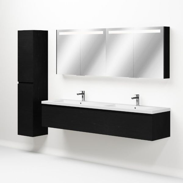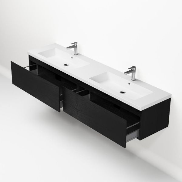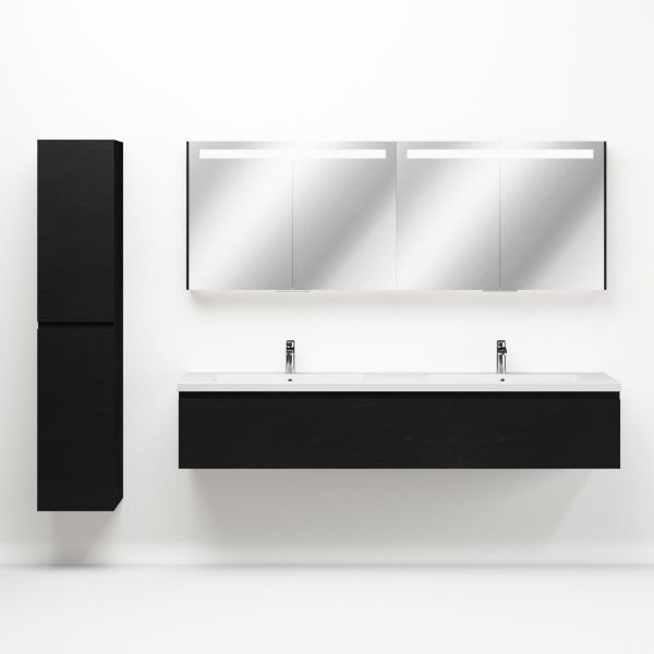Greeploos badkamermeubel in de kleur zwart mat eiken is 200 cm breed. De wastafel is vervaardig in polystone en heeft de kleur wit. Dit badkamermeubel met deze wastafel is leverbaar tussen de 60 cm t/m 160 cm
