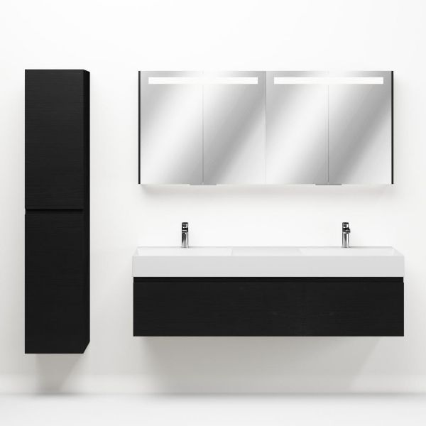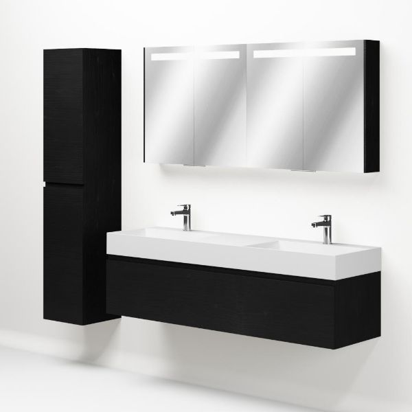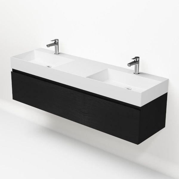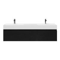 Greeploos badkamermeubel in de kleur zwart mat eiken is 160 cm breed. De wastafel is vervaardig in keramiek en heeft de kleur wit keramiek. Dit badkamermeubel met deze wastafel is leverbaar tussen de 60 cm t/m 160 cm