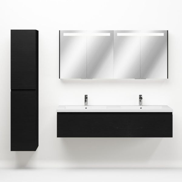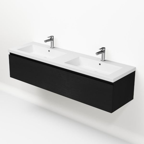 Greeploos badkamermeubel in de kleur zwart mat eiken is 160 cm breed.  De wastafel is vervaardig in polystone en heeft de kleur wit. Dit badkamermeubel met deze wastafel is leverbaar tussen de 60 cm t/m 160 cm