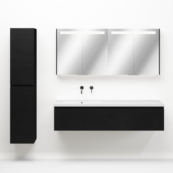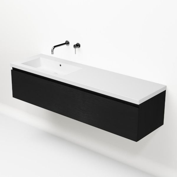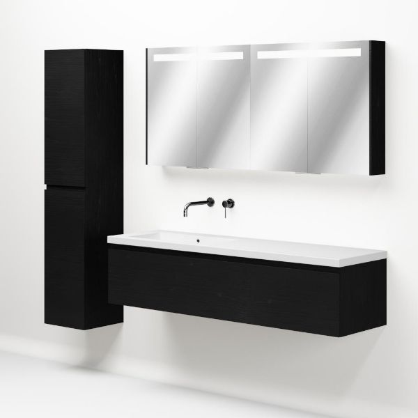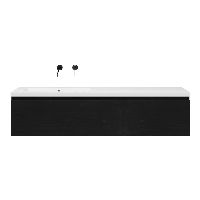 Greeploos badkamermeubel in de kleur zwart mat eiken is 160 cm breed.  De wastafel is vervaardig in polystone en heeft de kleur wit. Dit badkamermeubel met deze wastafel is leverbaar tussen de 60 cm t/m 160 cm