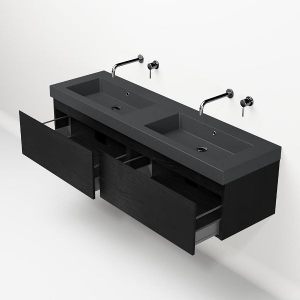 Bellanti Solo/Esta-Q badmeubel 160x46 2 softclose laden mat zwart eiken quartz dubbele wastafel mat grijs zonder kraangaten