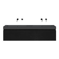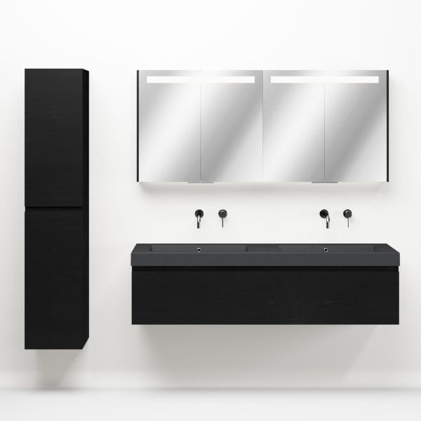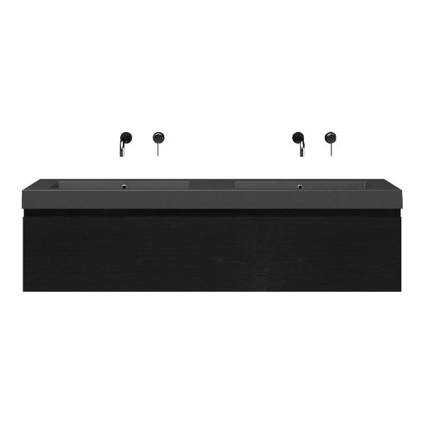 Greeploos badkamermeubel in de kleur zwart mat eiken is 160 cm breed.  De wastafel is vervaardig in quartz en heeft de kleur grijs mat quartz. Dit badkamermeubel met deze wastafel is leverbaar tussen de 60 cm t/m 160 cm