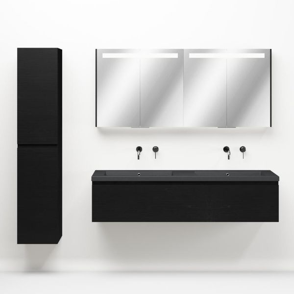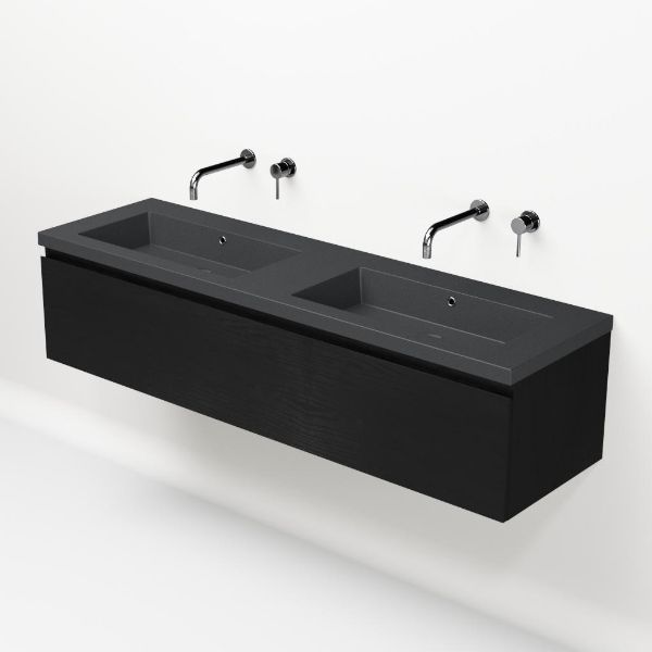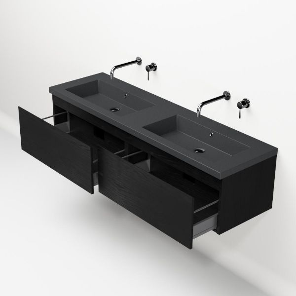 Greeploos badkamermeubel in de kleur zwart mat eiken is 160 cm breed. De wastafel is vervaardig in quartz en heeft de kleur grijs mat quartz. Dit badkamermeubel met deze wastafel is leverbaar tussen de 60 cm t/m 160 cm