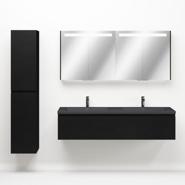 Greeploos badkamermeubel in de kleur zwart mat eiken is 160 cm breed. De wastafel is vervaardig in quartz en heeft de kleur grijs mat. Dit badkamermeubel met deze wastafel is leverbaar tussen de 60 cm t/m 160 cm