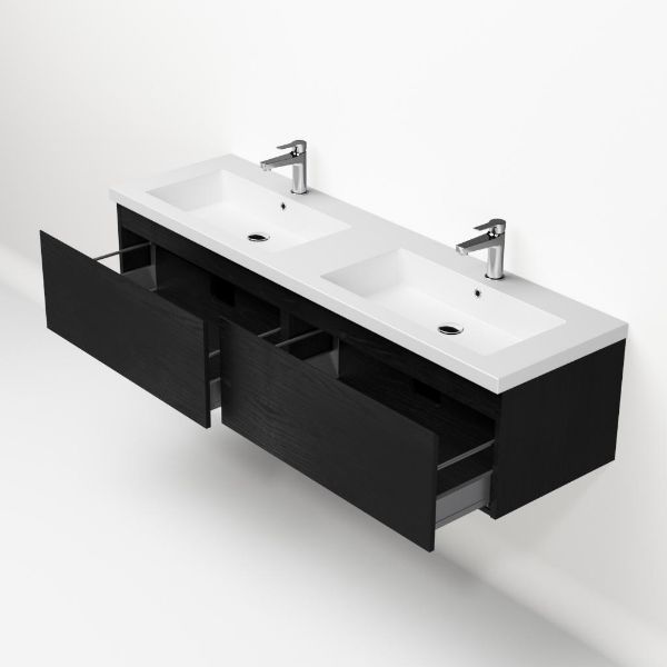 | | Bellanti Solo/Esta-Q badmeubel 160x46 2 softclose laden mat zwart eiken greeploos polystone dubbele wastafel mat grijs 2 kraangaten |