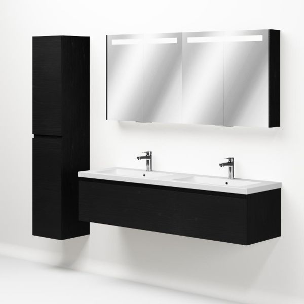 Greeploos badkamermeubel in de kleur zwart mat eiken is 160 cm breed. De wastafel is vervaardig in quartz en heeft de kleur grijs mat. Dit badkamermeubel met deze wastafel is leverbaar tussen de 60 cm t/m 160 cm