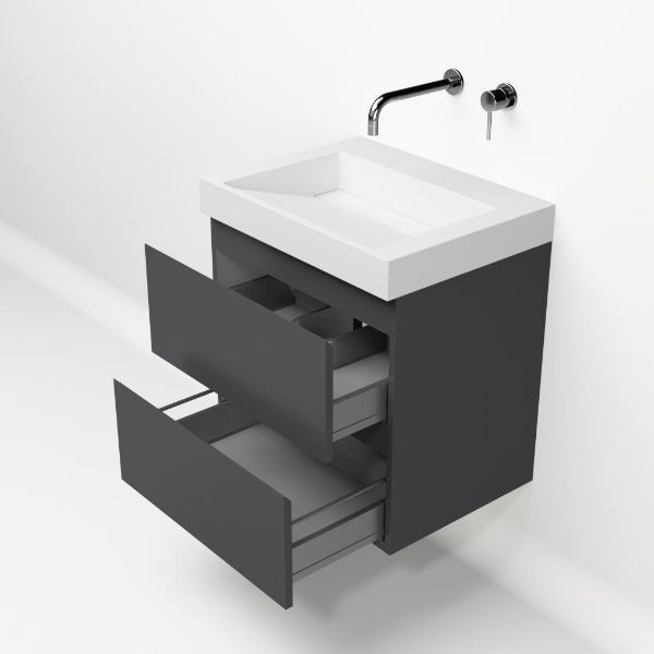 Greeploos badkamermeubel in de kleur antraciet mat is 60 cm breed. De wastafel is vervaardig in polystone en heeft de kleur wit. Dit badkamermeubel met deze wastafel is leverbaar tussen de 60 cm t/m 140 cm