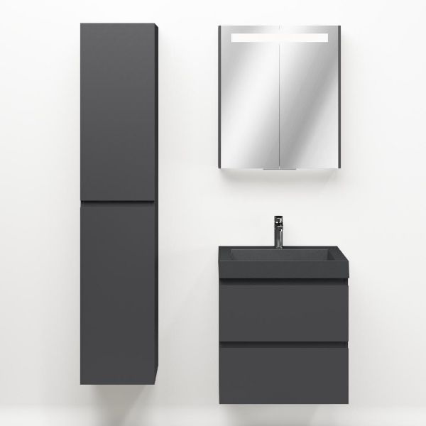 Greeploos badkamermeubel in de kleur antraciet mat is 60 cm breed. De wastafel is vervaardig in quartz en heeft de kleur grijs mat quartz. Dit badkamermeubel met deze wastafel is leverbaar tussen de 60 cm t/m 140 cm