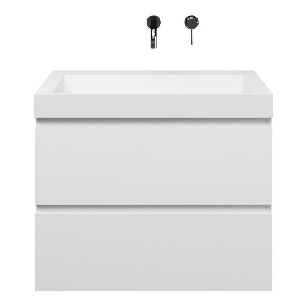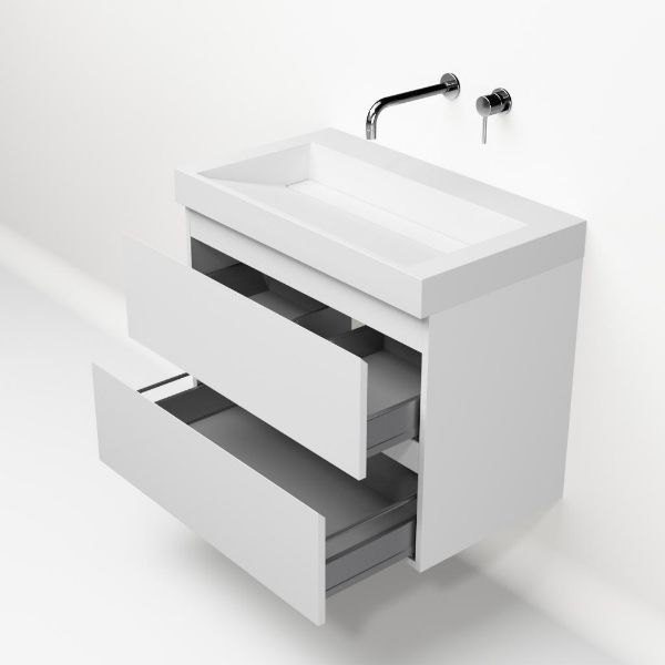Greeploos badkamermeubel in de kleur wit mat is 80 cm breed. De wastafel is vervaardig in polystone en heeft de kleur wit. Dit badkamermeubel met deze wastafel is leverbaar tussen de 60 cm t/m 140 cm