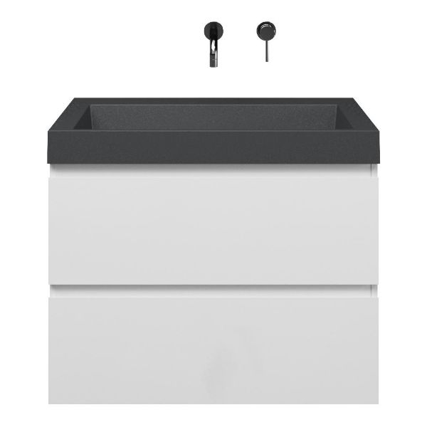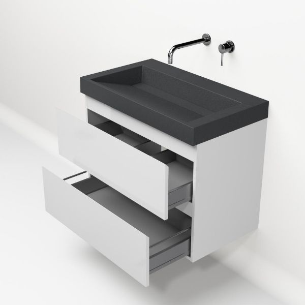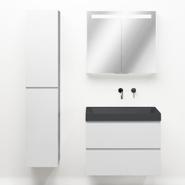 Greeploos badkamermeubel in de kleur wit hoogglans is 80 cm breed. De wastafel is vervaardig in quartz en heeft de kleur grijs mat quartz. Dit badkamermeubel met deze wastafel is leverbaar tussen de 60 cm t/m 140 cm