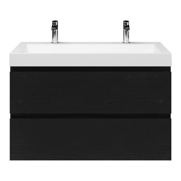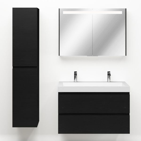 Greeploos badkamermeubel in de kleur zwart mat eiken is 100 cm breed. De wastafel is vervaardig in quartz en heeft de kleur wit mat quartz. Dit badkamermeubel met deze wastafel is leverbaar tussen de 60 cm t/m 140 cm