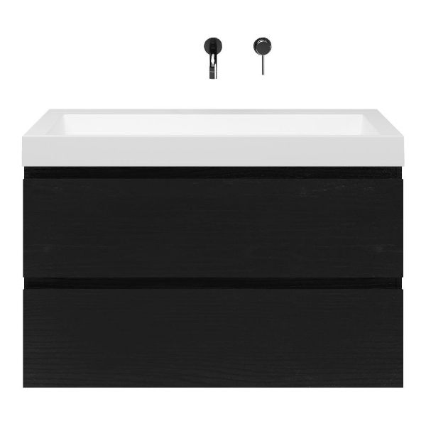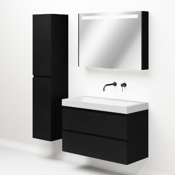 Greeploos badkamermeubel in de kleur zwart mat eiken is 100 cm breed. De wastafel is vervaardig in quartz en heeft de kleur wit mat quartz. Dit badkamermeubel met deze wastafel is leverbaar tussen de 60 cm t/m 140 cm
