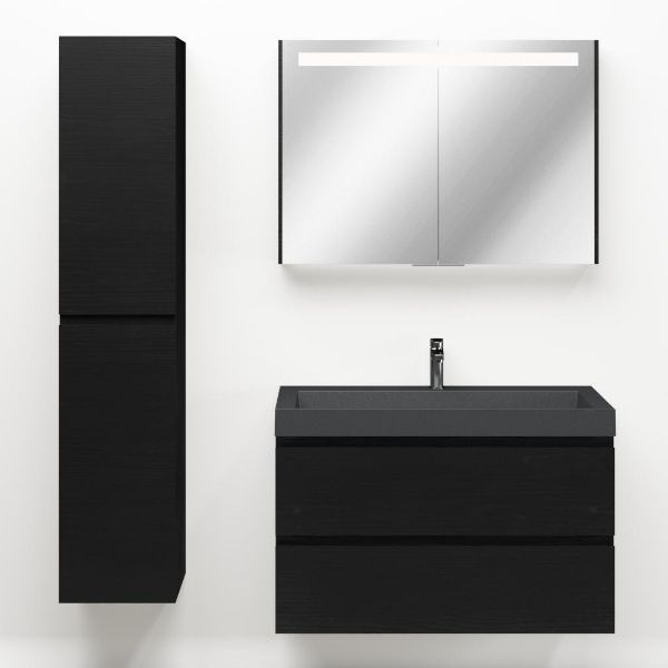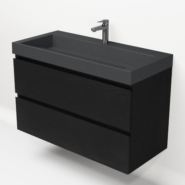 Greeploos badkamermeubel in de kleur zwart mat eiken is 100 cm breed. De wastafel is vervaardig in quartz en heeft de kleur grijs mat quartz. Dit badkamermeubel met deze wastafel is leverbaar tussen de 60 cm t/m 140 cm