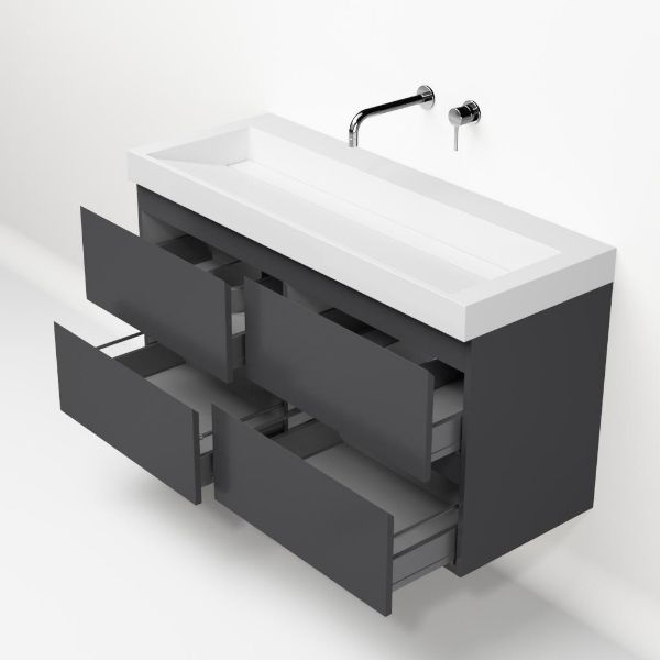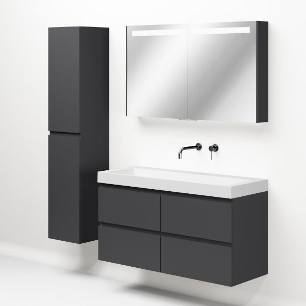 Greeploos badkamermeubel in de kleur antraciet mat is 120 cm breed. De wastafel is vervaardig in polystone en heeft de kleur wit. Dit badkamermeubel met deze wastafel is leverbaar tussen de 60 cm t/m 140 cm