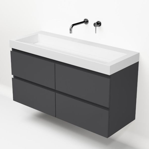 | | Bellanti Gisella/Renzo badmeubel 120x46 4 softclose laden antraciet mat greeploos polystone wastafel wit zonder kraangaten |