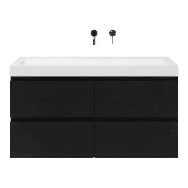 Greeploos badkamermeubel in de kleur zwart mat eiken is 120 cm breed. De wastafel is vervaardig in polystone en heeft de kleur wit. Dit badkamermeubel met deze wastafel is leverbaar tussen de 60 cm t/m 140 cm