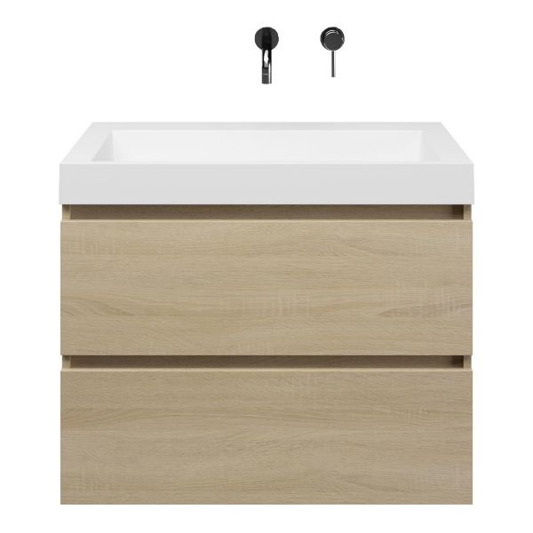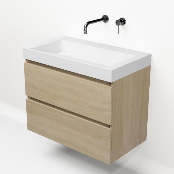 Greeploos badkamermeubel in de kleur eiken licht is 80 cm breed. De wastafel is vervaardig in polystone en heeft de kleur wit. Dit badkamermeubel met deze wastafel is leverbaar tussen de 60 cm t/m 200 cm