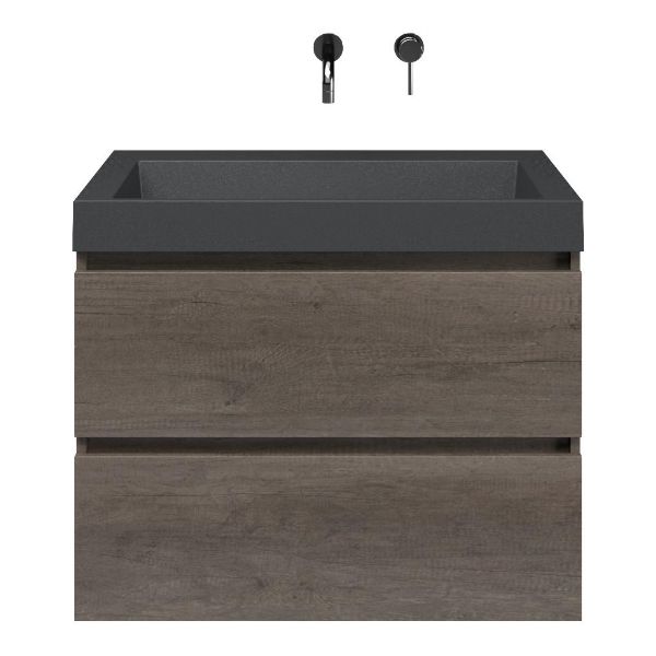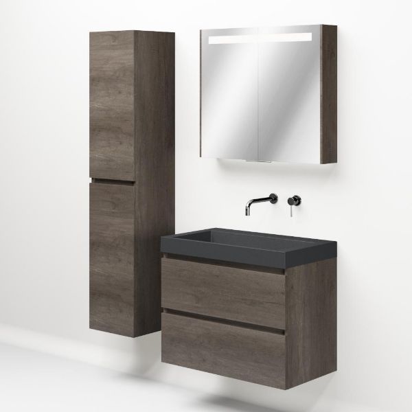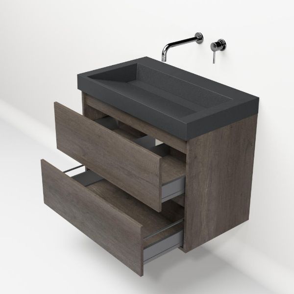 Greeploos badkamermeubel in de kleur olm donker grijs is 80 cm breed. De wastafel is vervaardig in quartz en heeft de kleur grijs mat quartz. Dit badkamermeubel met deze wastafel is leverbaar tussen de 60 cm t/m 200 cm